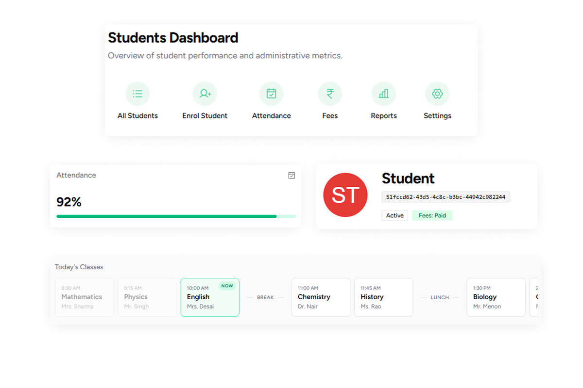 Create timetables, assign teachers, manage exams, and generate report cards with support for CBSE, ICSE, and state board grading patterns.